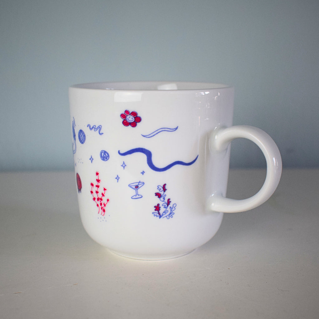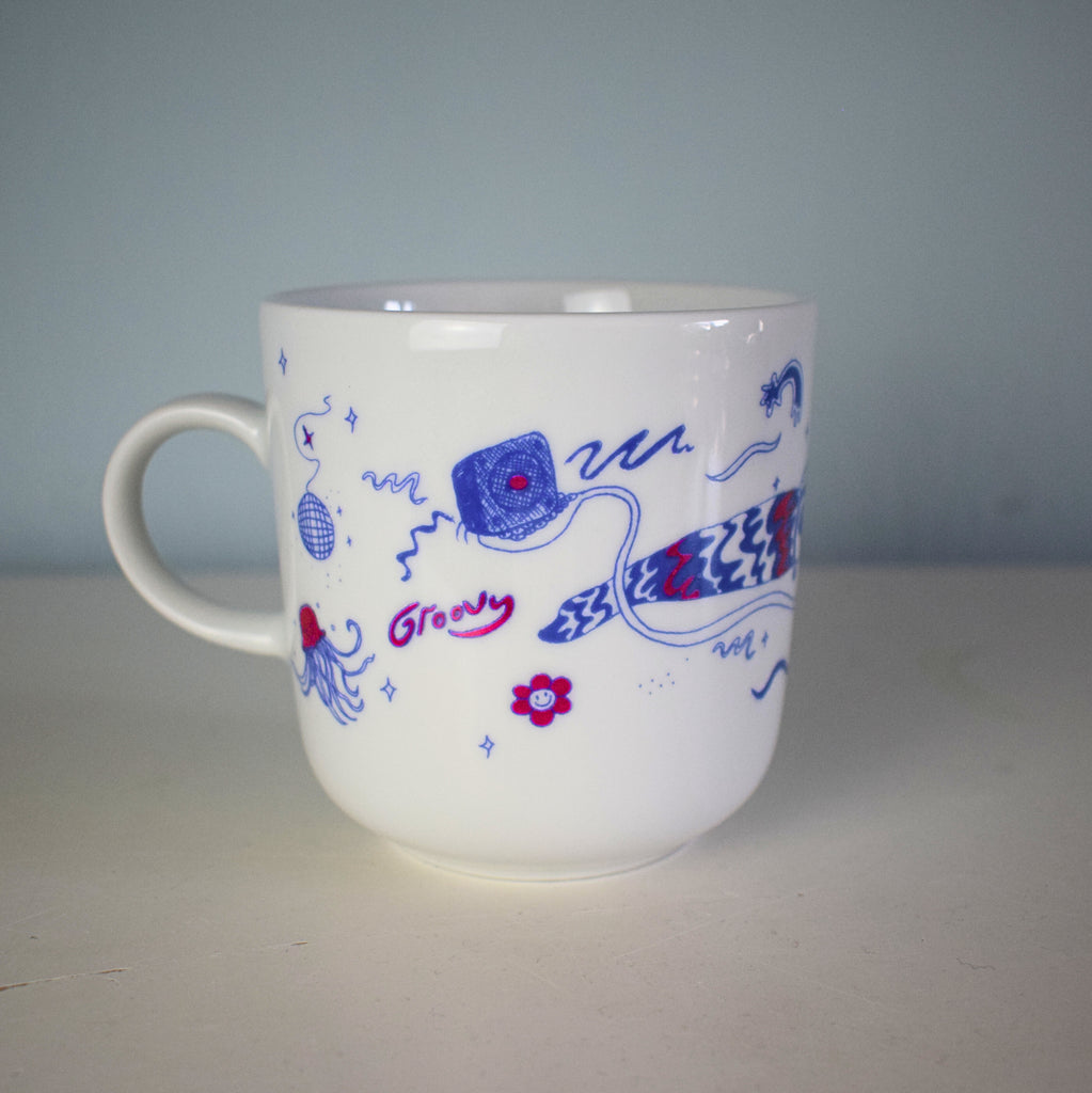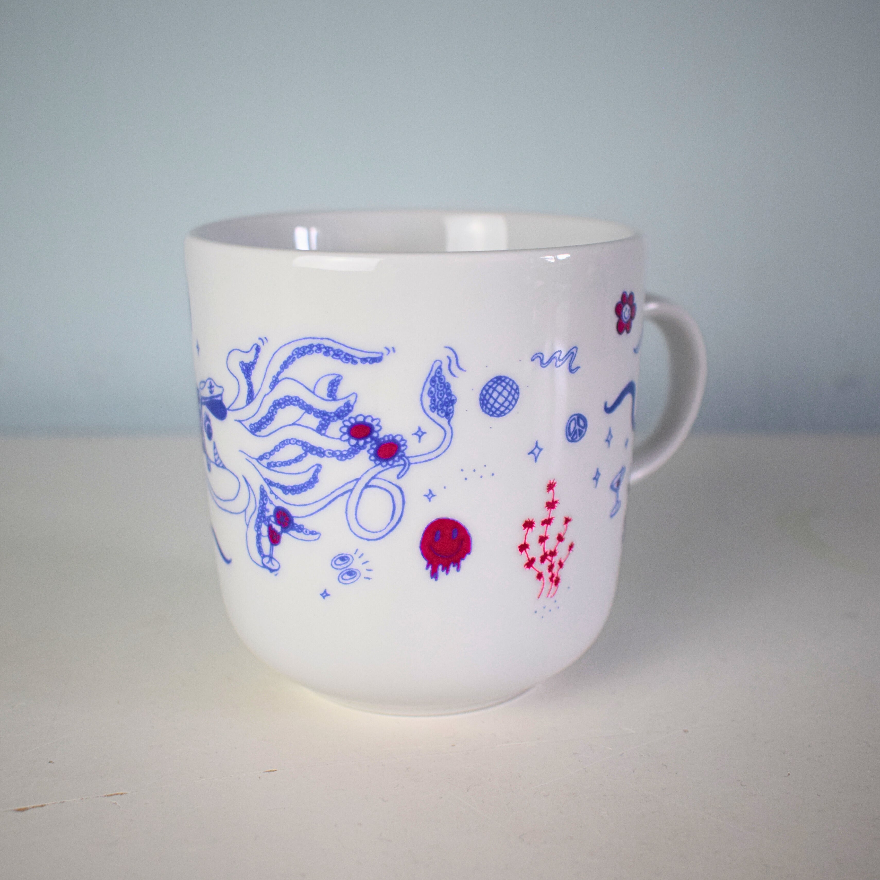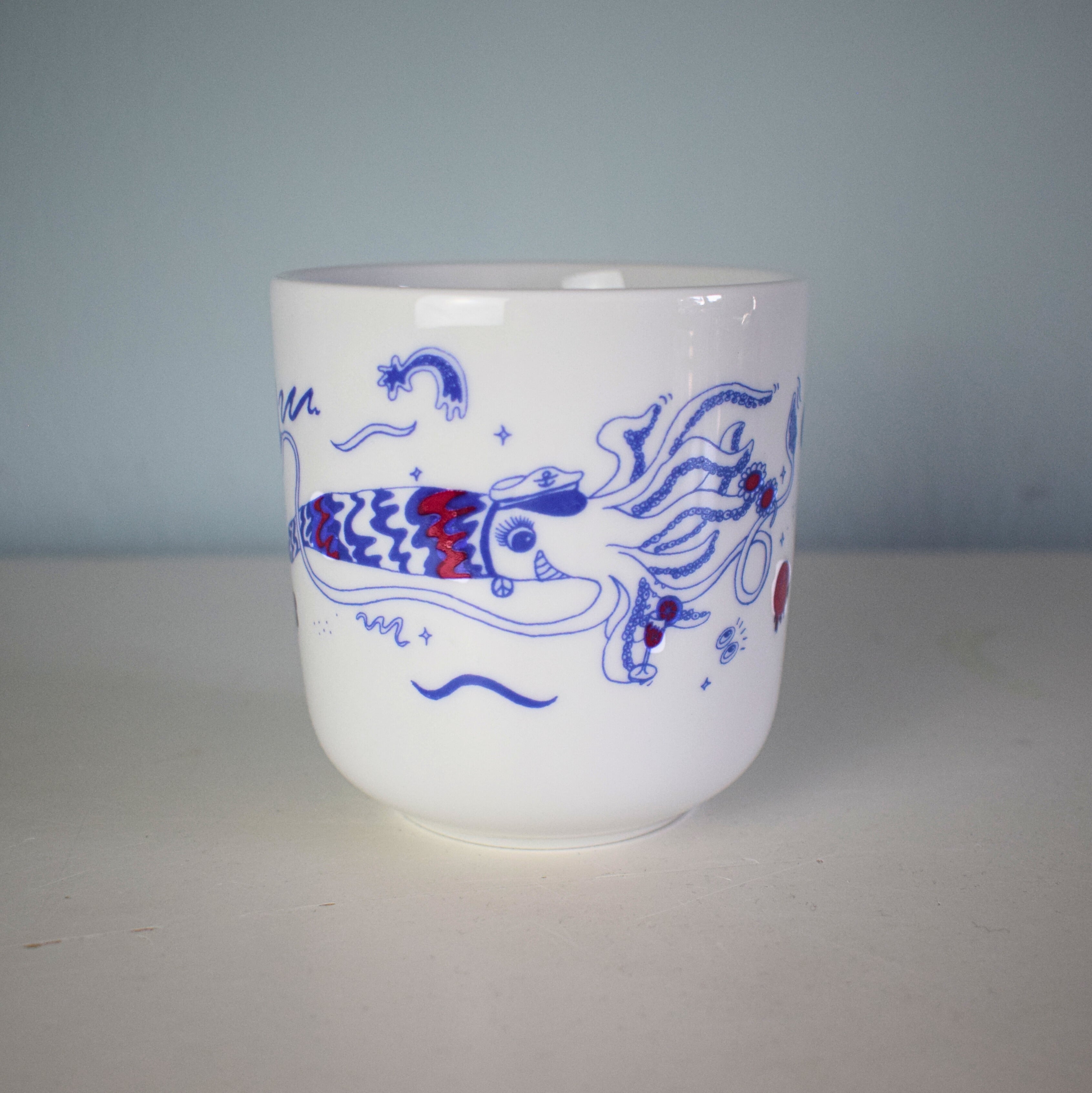 Ahoi Marie Sonderedition 2025. Die Groovy 2 - Riesenkalmar und Fetzenfisch. Wenn das kein Duo ist. In 2 Farben blau und rot grooven die über das Unterwasserparkett als Becher, Schale und Teller.